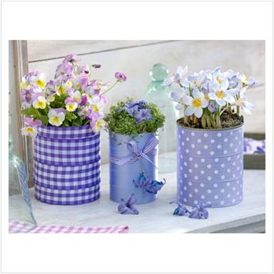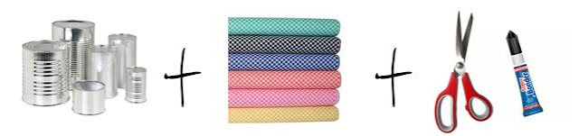 | Faça umas tiras de tecido e cole à volta da lata. A larguras das tiras fica ao seu critério, no entanto se a lata for mais pequena deve ter umas tiras mais estreitas. Divirta-se! |