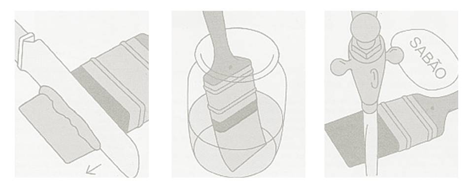 3. Para retirar os últimos vestígios de tinta, deve utilizar água morna com sabão ou detergente, e passar a trincha por água corrente.