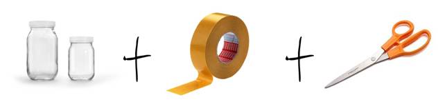 | Coloque fita dupla face a unir os frascos uns aos outros, coloque a fita da forma mais discreta possível e em pequenos pedaços, para não se visualizar, quando olhamos para o conjunto. |